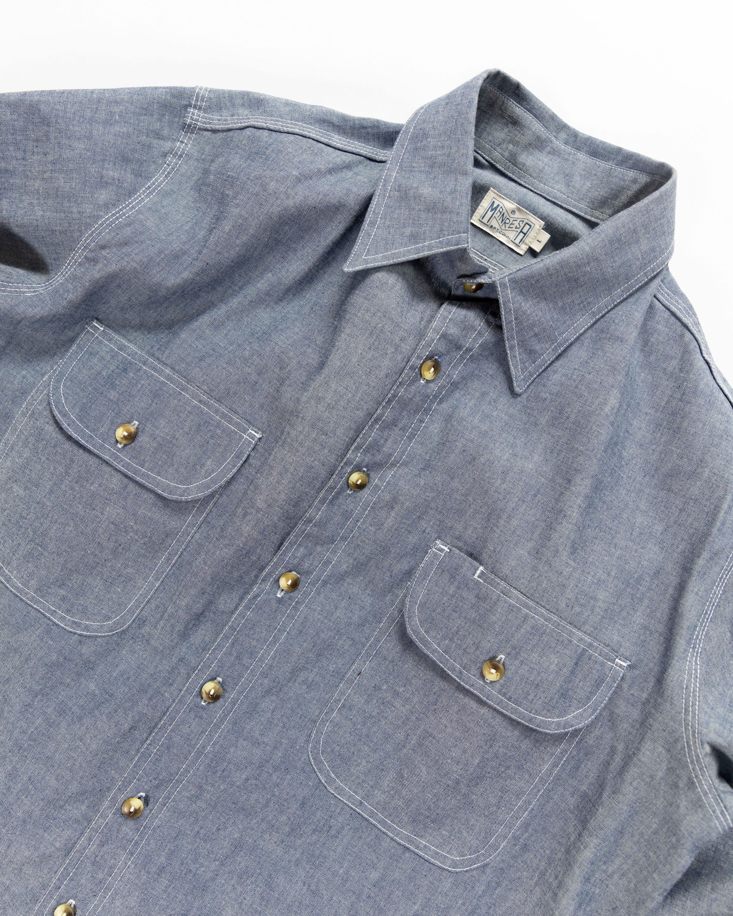 We modernized the fit of a vintage Sears and Roebuck work shirt from the 50s, including the triple stitch seams for extra durable construction, and built it from 5 oz. Japanese selvedge chambray, with tri-color cream, mocha, java cateye buttons cause they look like that sick moment when you mix a little milk into your coffee in the morning before heading off to... (wait for it) ...work. Classic shuttle label for the win. Patterned, cut and sewn in Bridgeport, Conn.