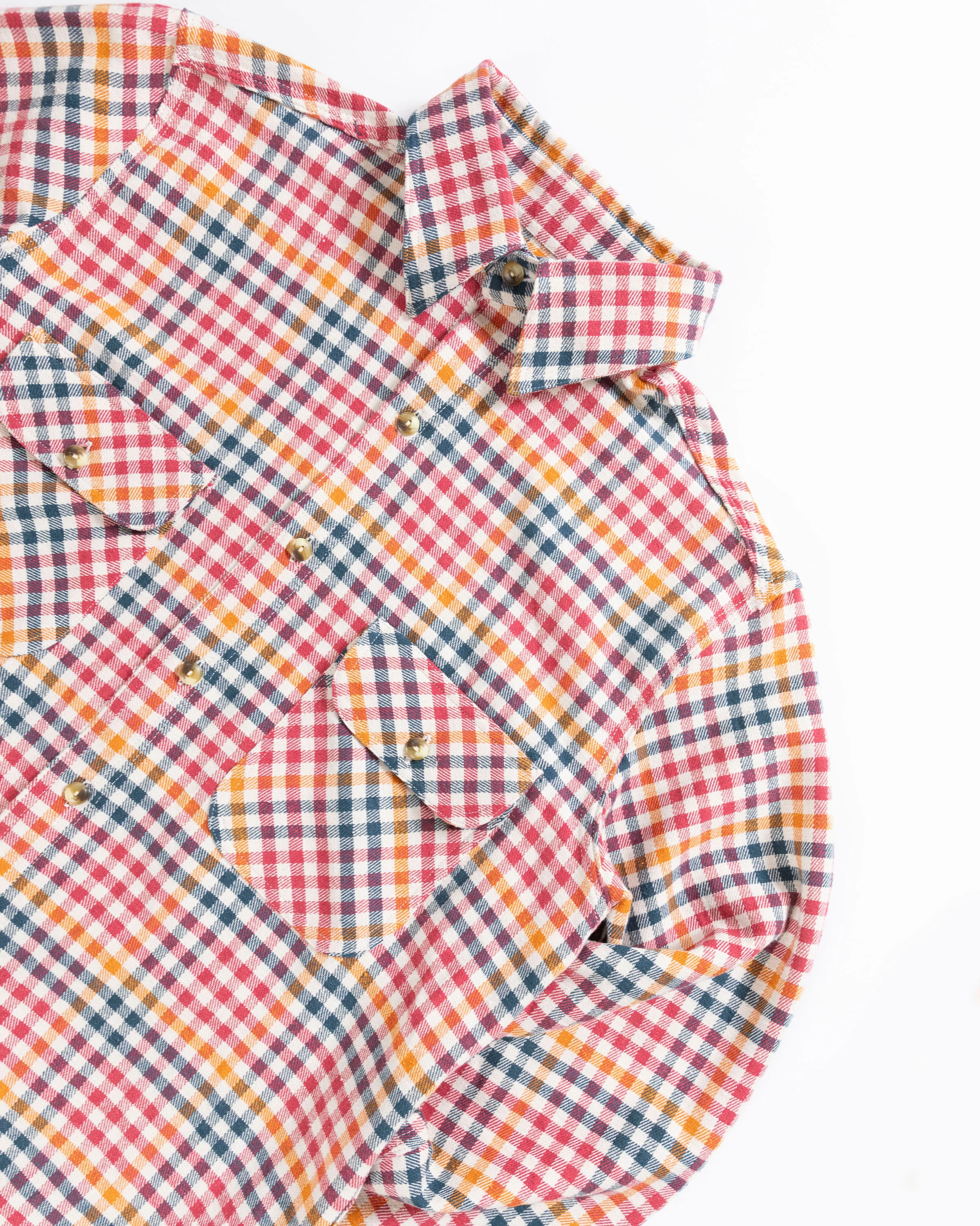 We dialed in the fit of this shirt and perfected the old world style gusset, with the three needle chainstitch runoff (thats functional and more efficient to sew, not just for looks). Also we ran it in this loosely woven cotton plaid shirting that feels and looks like a 50's table cloth, in the best way.